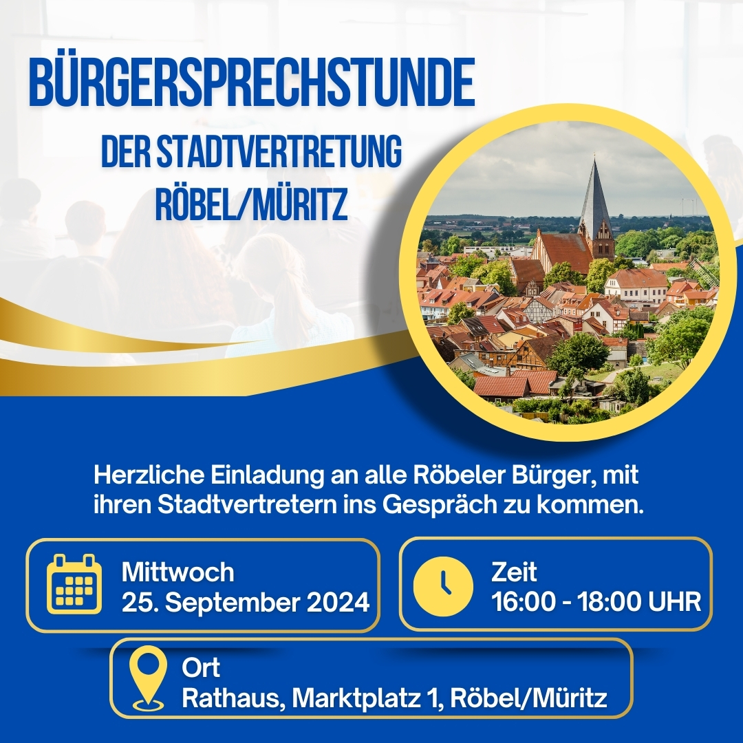 Röbels Stadtpräsidium und die Mitglieder der Stadtvertretung bieten monatlich eine Bürgersprechstunde an, zu der alle Bürger der Stadt herzlich eingeladen sind.